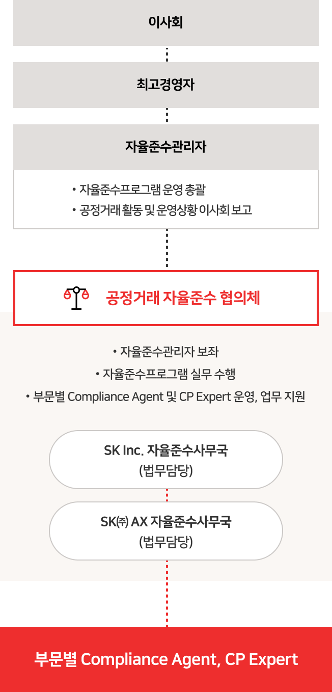 SK주식회사는 기업의 사회적 책임, 준법 경영에 대한 주주, 사회 등 SK주식회사를 둘러싼 이해관계자들의 요구와 관심에 부응하기 위해 ‘Compliance’ 시스템을 구축∙운영하고 있습니다.